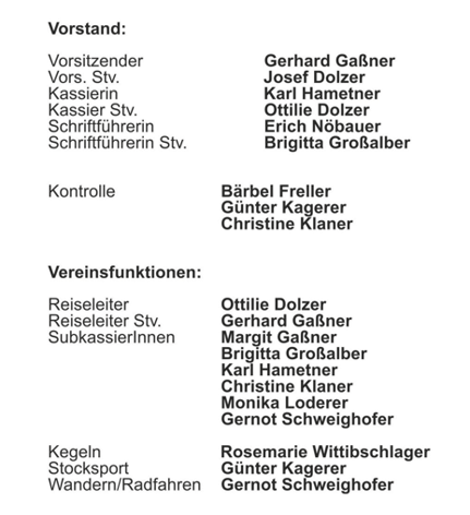 Der Zeitaufwand beim Pensionistenverein ist gering, es macht aber Spaß, mit Gleichgesinnten, Freunden oder ehemaligen Schulkollegen Karten spielen, kegeln, …. oder was auch immer, im Jahresprogramm kann man auswählen, was spricht mich an, was gefällt mir, wo bin ich dabei. J